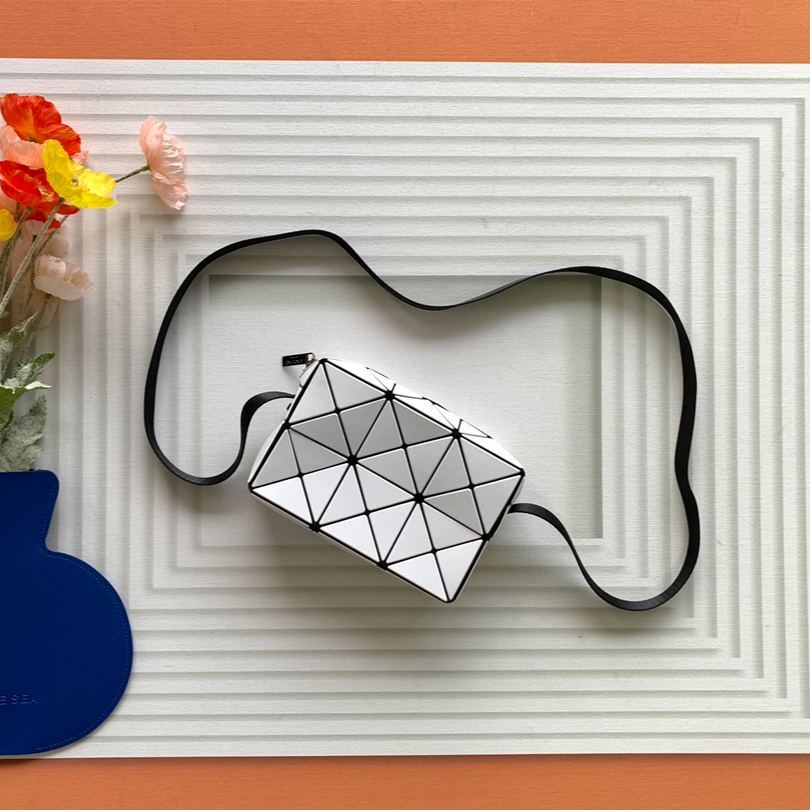 ISSEY MIYAKEのキューピッドボックスミニバッグは、17×11×5.5cmのコンパクトサイズながら、スマホや薄い財布などの日常必需品を収納可能。特徴的な三角形プレートを組み合わせたデザインで、光の加減で変化する質感が魅力。調整可能なショルダーストラップにより、斜め掛け・ショルダー・ハンドキャリーの3WAYスタイルに対応。軽量な素材を使用しているため、長時間の使用でも疲れにくい。